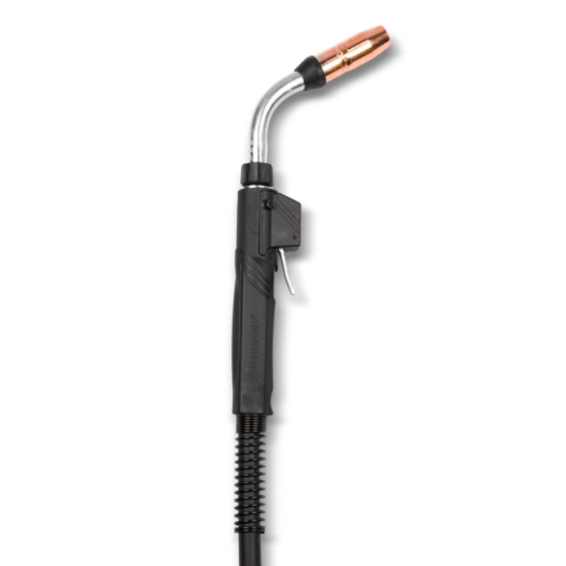 Diseñada para ofrecer un rendimiento industrial confiable en aplicaciones MIG de alto uso. Este modelo está configurado para un amperaje nominal de 400 A y cuenta con un cable de 15 pies (aprox. 4.6 m) que proporciona un amplio rango de movimiento durante la operación, ideal para trabajos extensos o de difícil acceso. Su diseño refrigerado por aire permite mantener temperaturas de operación estables sin necesidad de sistemas de enfriamiento complejos, simplificando el mantenimiento y aumentando la durabilidad de la herramienta. Equipada con un mango recto y un cuello medio fijo, esta pistola ofrece una ergonomía equilibrada que favorece el control durante la soldadura, mientras que la alimentación trasera de alambre (.078 in) asegura un flujo de hilo constante. La construcción robusta y los materiales de calidad responden a las exigencias de operaciones continuas y condiciones industriales, ofreciendo fiabilidad en cada ciclo de soldadura. El conector trasero estilo Miller facilita la conexión al alimentador de alambre y a la fuente de poder, lo que contribuye a una instalación sencilla y segura. En conjunto, la Q4015MS3EMC representa una opción sólida para quienes requieren una pistola MIG duradera, eficiente y de desempeño constante en entornos de soldadura profesional.