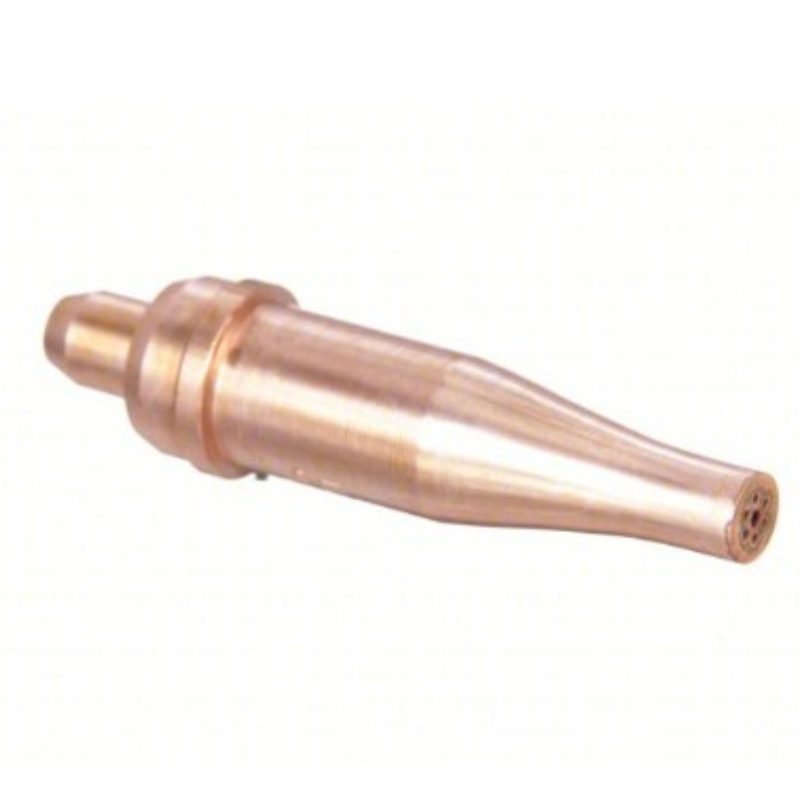 Punta de oxicorte diseñada para trabajar con oxígeno y acetileno en aplicaciones de corte de acero. Permite realizar cortes en materiales de aproximadamente 1 a 1-1/2 pulgadas de espesor, proporcionando un flujo estable de gases que ayuda a obtener un corte uniforme y eficiente en procesos de fabricación, mantenimiento y reparación industrial.