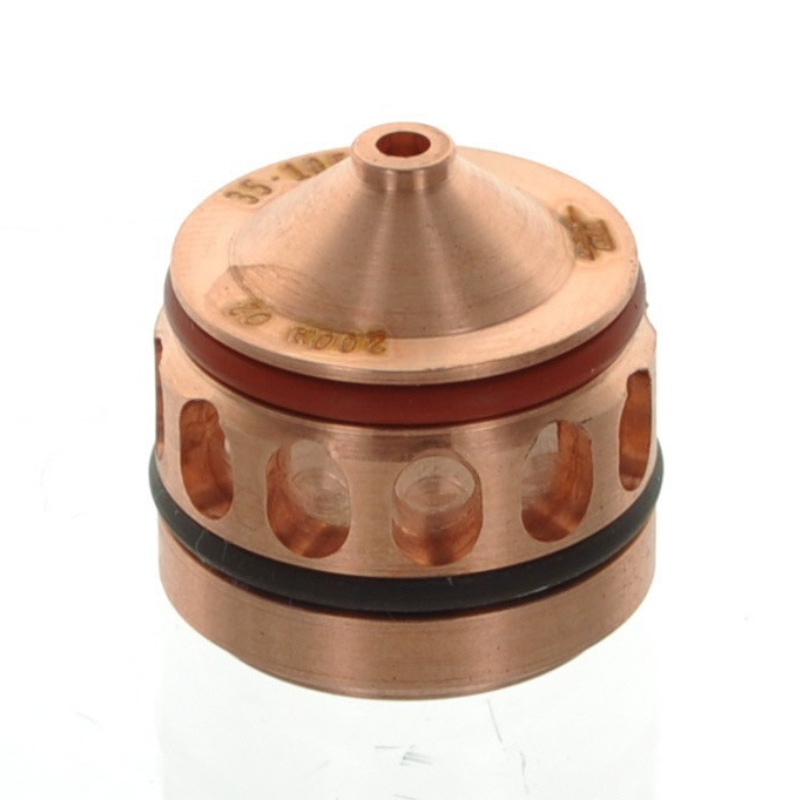 Consumible para sistemas de corte por plasma fabricados por Thermal Dynamics / Victor, correspondiente a una boquilla de corte (tip) utilizada en antorchas de plasma industriales de la serie Auto-Cut / XT / sistemas de 200 amperios. La boquilla es uno de los componentes más importantes del conjunto de consumibles, ya que se encarga de concentrar el arco de plasma y dirigir el flujo de gas hacia el material, permitiendo realizar cortes precisos, uniformes y con buena calidad de acabado. Este modelo está diseñado para trabajar en aplicaciones de aproximadamente 200A, y se utiliza junto con otros consumibles compatibles como electrodo, distribuidor de gas, shield cap y retenedor, formando un sistema completo que garantiza el funcionamiento correcto de la antorcha. Según tablas de consumibles de Thermal Dynamics, el número 35-1056 aparece como tip dentro del conjunto de piezas utilizadas en configuraciones de corte con oxígeno o aire en equipos Auto-Cut de alta capacidad, lo que confirma su uso como boquilla de plasma dentro del sistema de corte industrial. La pieza está fabricada con materiales resistentes a altas temperaturas y desgaste, permitiendo mantener la estabilidad del arco y prolongar la vida útil del equipo cuando se utiliza correctamente. El uso de la boquilla adecuada es fundamental para evitar mala calidad de corte, exceso de escoria o daño en la antorcha, por lo que el 35-1056 es un consumible esencial en el mantenimiento y operación de equipos de corte por plasma utilizados en fabricación, mantenimiento y procesos metalmecánicos.