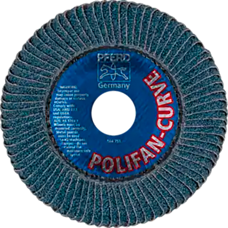 PFERD 67689032 es un disco laminar POLIFAN CURVE de 4-1/2 pulgadas x 7/8 pulgada con grano #40 de zircornia de aluminio diseñado para desbaste agresivo y acabado uniforme, permitiendo acceso a radios y cantos en acero y acero inoxidable con alta productividad y larga vida útil.