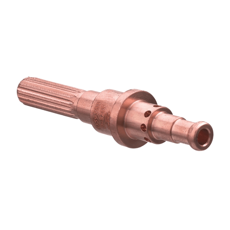 Consumible original de Thermal Dynamics / Victor / ESAB, correspondiente a una boquilla de corte (tip) diseñada para utilizarse en antorchas de plasma SL60 y SL100, las cuales se emplean en equipos de corte por plasma de la serie Cutmaster y sistemas manuales de aire plasma. La boquilla es uno de los componentes más importantes dentro del conjunto de consumibles, ya que se encarga de concentrar el arco de plasma y dirigir el flujo de aire hacia el material, permitiendo obtener cortes precisos, uniformes y con buena calidad de acabado. El número de parte 9-8215 se utiliza en configuraciones de amperaje medio, donde se requiere un equilibrio entre velocidad de corte, estabilidad del arco y duración del consumible. Esta boquilla se usa junto con otros componentes compatibles como el electrodo 8-7503, el swirl ring 8-8212, el retenedor 9-8211 y las copas protectoras de la serie 9-8209 / 9-8210, formando un sistema completo diseñado para mantener el correcto funcionamiento de la antorcha. Está fabricada con materiales resistentes a altas temperaturas y desgaste, lo que permite soportar las condiciones severas del corte por plasma en aplicaciones industriales, fabricación metalmecánica, mantenimiento y construcción. El uso de la boquilla adecuada es fundamental para evitar mala calidad de corte, exceso de escoria o daño en la antorcha, por lo que el 9-8215 es un consumible esencial para mantener el rendimiento y la seguridad de los equipos Thermal Dynamics en aplicaciones profesionales de corte por plasma.