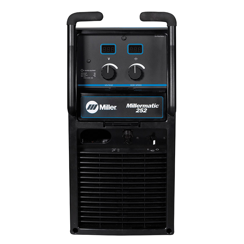 Es una soldadora “MIG” de alto desempeño diseñada para ofrecer potencia, estabilidad y facilidad de uso en aplicaciones industriales, automotrices, agrícolas y de fabricación metálica. Proporciona una salida máxima de 252 amperios y una capacidad de soldadura de hasta media pulgada en una sola pasada, lo que la convierte en una opción confiable para trabajos exigentes. Incorpora un motor de alimentación de alambre de alto torque con transmisión de engranes de aluminio que asegura alimentación estable incluso con carretes de gran tamaño. Su ciclo de trabajo es del cuarenta por ciento a doscientos amperios, permitiendo productividad constante en sesiones prolongadas. El panel frontal incluye control de velocidad de alambre dependiente e independiente del voltaje, facilitando un ajuste preciso del arco. Puede utilizar carretes de diez y cuarenta libras y es compatible con aluminio mediante sistema Spoolmatic o alimentador XR, lo que amplía la gama de materiales que puede trabajar. Su diseño integra protección térmica automática y un sistema de regulación interna que mantiene la calidad del arco aun con variaciones en la energía eléctrica. También cuenta con capacidad para soldar acero dulce, acero inoxidable y aluminio en calibres delgados y espesores medios. En conjunto, la Millermatic 252 combina potencia, simplicidad operativa y durabilidad, posicionándose como una máquina confiable y versátil para talleres profesionales y entornos industriales.