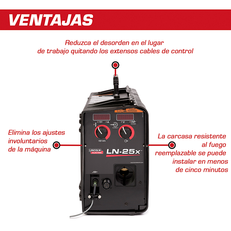 El alimentador de alambre Lincoln Electric LN-25X con número de parte K4267-2 es un consumible de alto desempeño diseñado para procesos de soldadura MIG y FCAW en aplicaciones de construcción, fabricación estructural y mantenimiento industrial. Esta unidad portátil incluye tecnologías avanzadas CrossLinc y True Voltage Technology (TVT) que permiten controlar el voltaje de soldadura directamente desde el alimentador sin necesidad de cables de control, lo que reduce el desorden de cables y mejora la seguridad y productividad en el sitio de trabajo. El sistema CrossLinc se comunica con la fuente de poder compatible a través de los mismos cables de soldadura, mientras que TVT compensa automáticamente la caída de voltaje en cables largos para mantener un arco consistente. El LN-25X cuenta con un sistema de alimentación de 2 rodillos capaz de alimentar alambre sólido y tubular con diámetros de hasta 1/16 pulgadas y 5/64 pulgadas respectivamente, y tiene una capacidad máxima de hasta 450 amperes de salida. La unidad se alimenta con voltaje de control de 15 a 110 V DC y está construida para soportar condiciones exigentes gracias a su encapsulado resistente y componentes protegidos contra la intemperie. Incluye contactos Tweco®, solenoide de gas y clip sensor de arco, ofreciendo una solución completa para alimentadores semiautomáticos en entornos exigentes como construcción de estructuras, trabajos pesados y operaciones de campo.