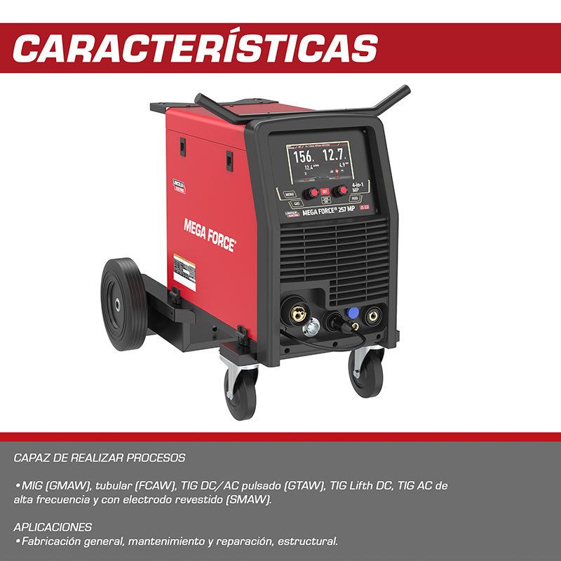 La soldadora Lincoln Electric Mega Force 257 MP con número de parte K69089-2 es un equipo multiproceso con tecnología inverter diseñado para ofrecer alto desempeño, versatilidad y confiabilidad en aplicaciones industriales, mantenimiento y fabricación metálica. Este modelo permite trabajar con procesos MIG, TIG y electrodo revestido, brindando un arco estable y controlado que facilita soldaduras limpias y consistentes en acero al carbono, acero inoxidable y otros materiales compatibles. Su amplio rango de corriente, que alcanza aproximadamente hasta 257 amperes según el proceso utilizado, permite adaptarse tanto a trabajos ligeros como a aplicaciones de mayor exigencia, ofreciendo flexibilidad para distintos espesores de material. La tecnología inverter mejora la eficiencia energética del equipo, reduce el consumo eléctrico y proporciona una respuesta de arco más suave en comparación con máquinas convencionales. El diseño compacto y robusto de la Mega Force 257 MP facilita su uso en talleres, plantas industriales y trabajos de mantenimiento, mientras que su panel de control intuitivo permite ajustes rápidos y precisos de los parámetros de soldadura. Este equipo está pensado para soldadores profesionales que requieren una solución multiproceso confiable, con la calidad y respaldo característicos de Lincoln Electric, convirtiéndolo en una opción sólida para producción ligera a media, reparación industrial y trabajos estructurales.
