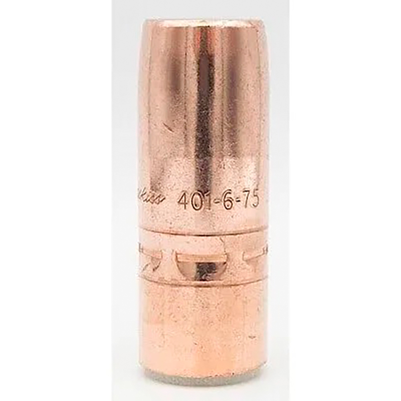 Boquilla MIG Tregaskiss 401-6-75 tipo slip-on de servicio pesado con diámetro interno de 3/4″ y 1/8″ de receso, fabricada en cobre con aislamiento, diseñada para uso en antorchas MIG de hasta 450 A y compatible con sistemas TOUGH LOCK/TOUGH ACCESS en aplicaciones industriales.