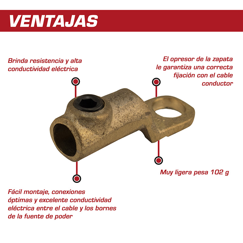La zapata para cable Lincoln es una pieza de repuesto y accesorio diseñado para conexiones eléctricas robustas en equipos de soldadura y aplicaciones industriales donde se requiere una transmisión de corriente confiable. Esta zapata está fabricada en cobre de alta conductividad y diseñada para cables de calibre 2/0, lo que la hace ideal para sistemas de soldadura de hasta 350 amperios en procesos como MIG, TIG y electrodo revestido. Su tornillo opresor de 1/2 pulgada garantiza una fijación firme y segura del cable conductor, reduciendo la caída de tensión y asegurando un contacto eléctrico estable que mejora la eficiencia de la transmisión de corriente desde la fuente de soldadura hasta los accesorios o cables de trabajo. La construcción robusta de esta zapata permite su uso en entornos exigentes y de trabajo pesado, ofreciendo durabilidad y resistencia al desgaste prematuro. Para mantenimientos correctivos o preventivos de sistemas eléctricos de soldadura esta zapata es un componente esencial que ayuda a mantener la fiabilidad del equipo y a reducir interrupciones por fallos de contacto. Al ser un accesorio original Lincoln Electric obtiene la compatibilidad y calidad esperada en cada conexión que se realiza, asegurando rendimiento consistente y larga vida útil en operaciones continuas de soldadura.